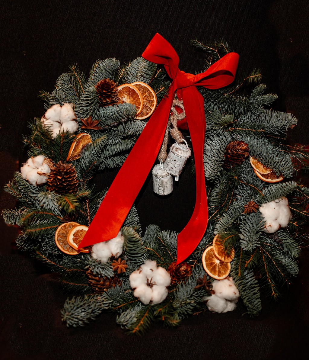 Kit-ul conține: suport de coroniță, brad natural nobil și elemente decorative naturale de portocale, flori de bumbac, felii de portocală și alte minunății cu miros de Crăciun.