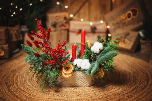 Ornamentul din brad natural cu lumanari contine: brad natural nobil, 2 lumanari, crengute de Ilex, flori de bumbac, felii de portocala si alte elemente naturale care te vor incanta cu miros de sarbatoare.