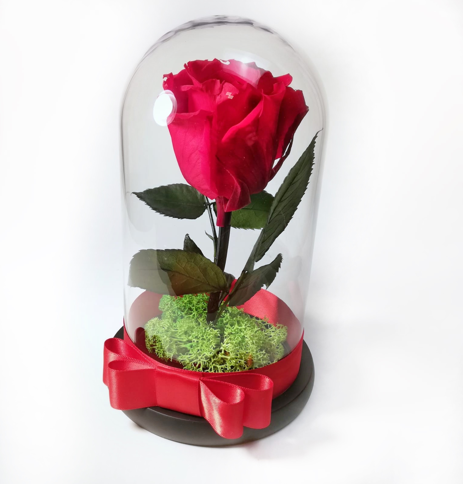 Detalii despre produs: dimensiunile cupolei de sticla cu blat de lemn, negru, sunt: diametrul 10 cm, inaltimea 18 cm. Trandafirul este conservat dupa tehnica de criogenare si rezista mai bine de 10 ani. De asemenea, lichenii decorativi sunt stabilizati si au durata de viata mai mare de 10 ani. Se pastreaza in conditii normale, nu necesita intretinere sau ingrijire, decat sa nu fie lasati in lumina directa a soarelui.